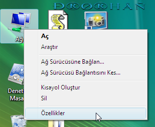 Masaüstünden Ağ simgesine sağ tıklıyoruz ve özellikler menüsünü açıyoruz.