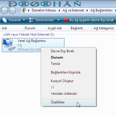 Karşımıza Bilgisayarımızdaki bütün Ağ bağlantıları gelecektir. Buradan Ethernet kartına ait olanı seçip sağ tıklıyoruz ve Özelliklere tıklıyoruz.