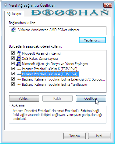 Gelen Pencereden Internet İletişim Kurallarını (TCP/IPv4) olanı seçip Özellikler düğmesine basıyoruz.