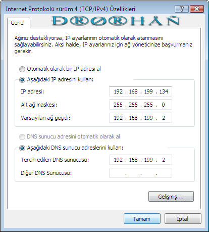Varsayılan ağ geçidini ve Yeğlenen DNS kısmına da ADSL modemin IP sını yazıoruz.